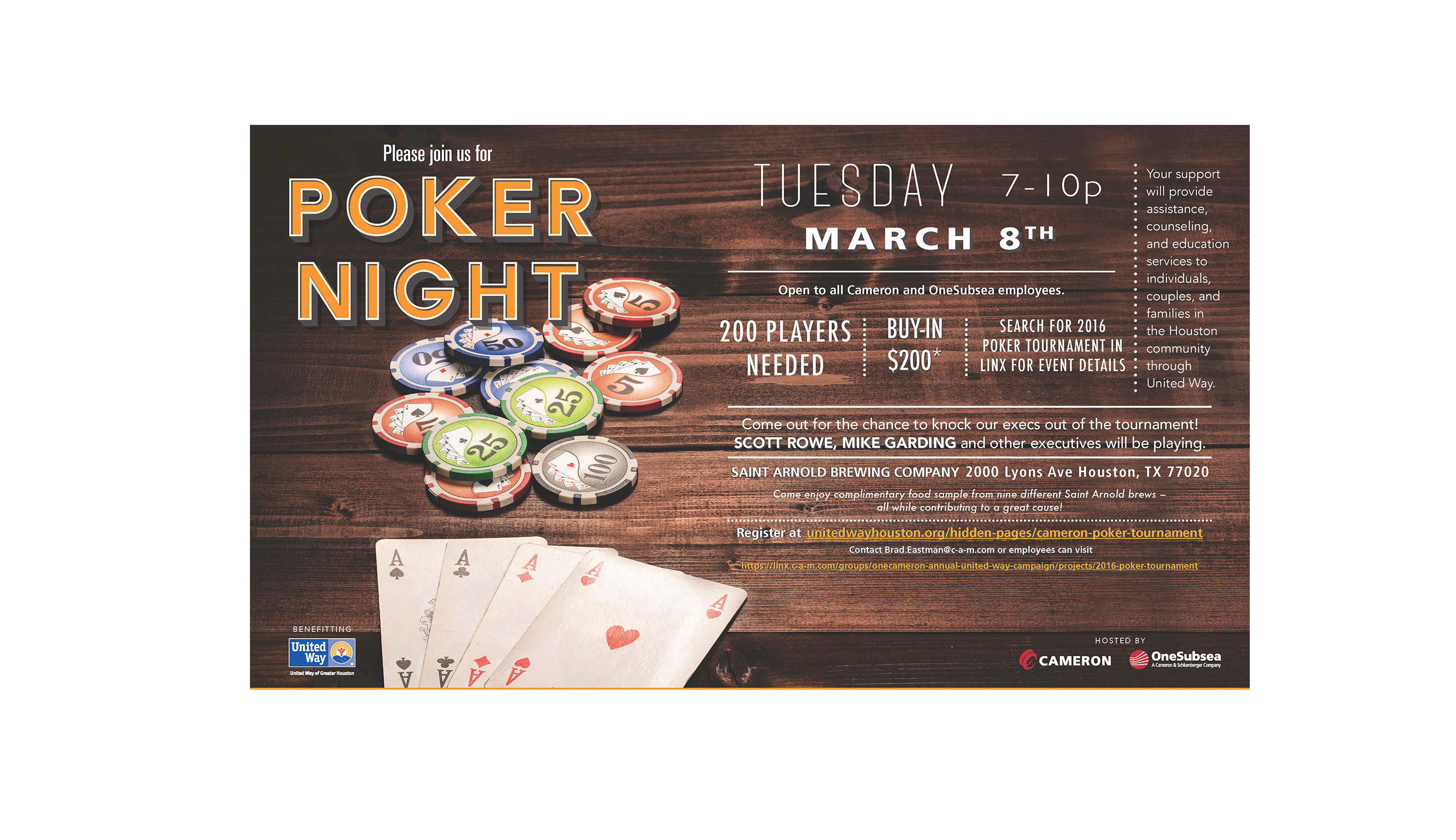 Once again, Global joins Cameron and OneSubsea to sponsor the 2016 UnitedWay poker night held at St. Arnold's brewry in downtown Houston.